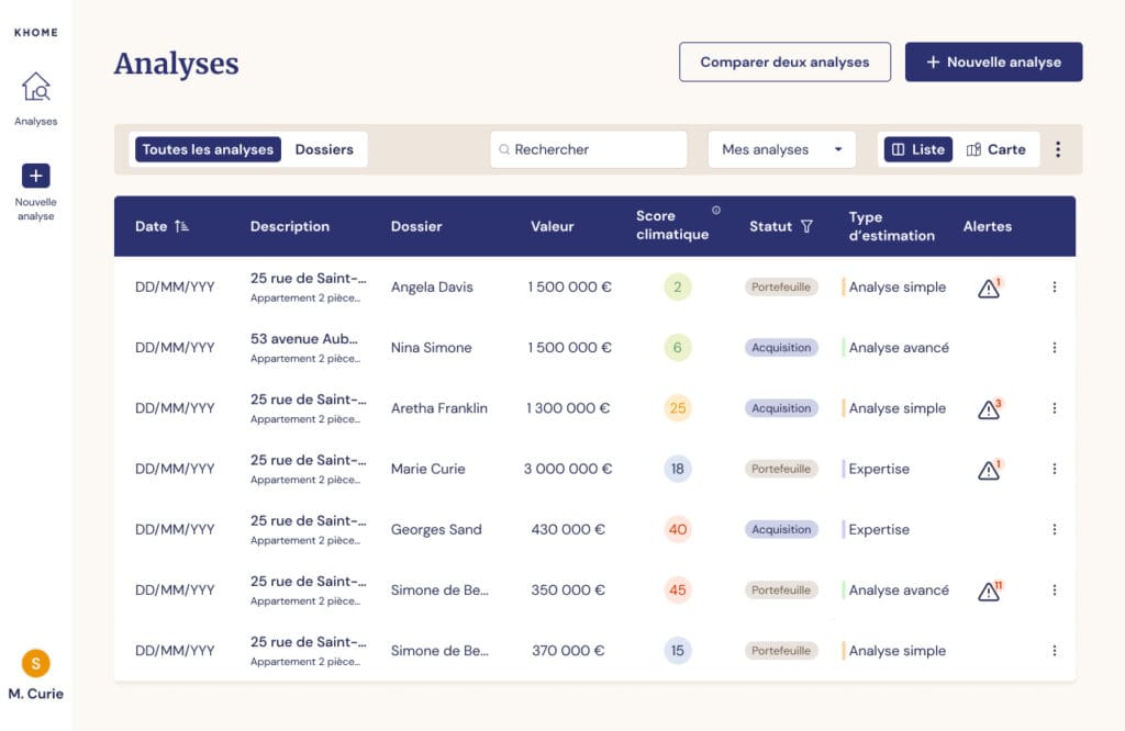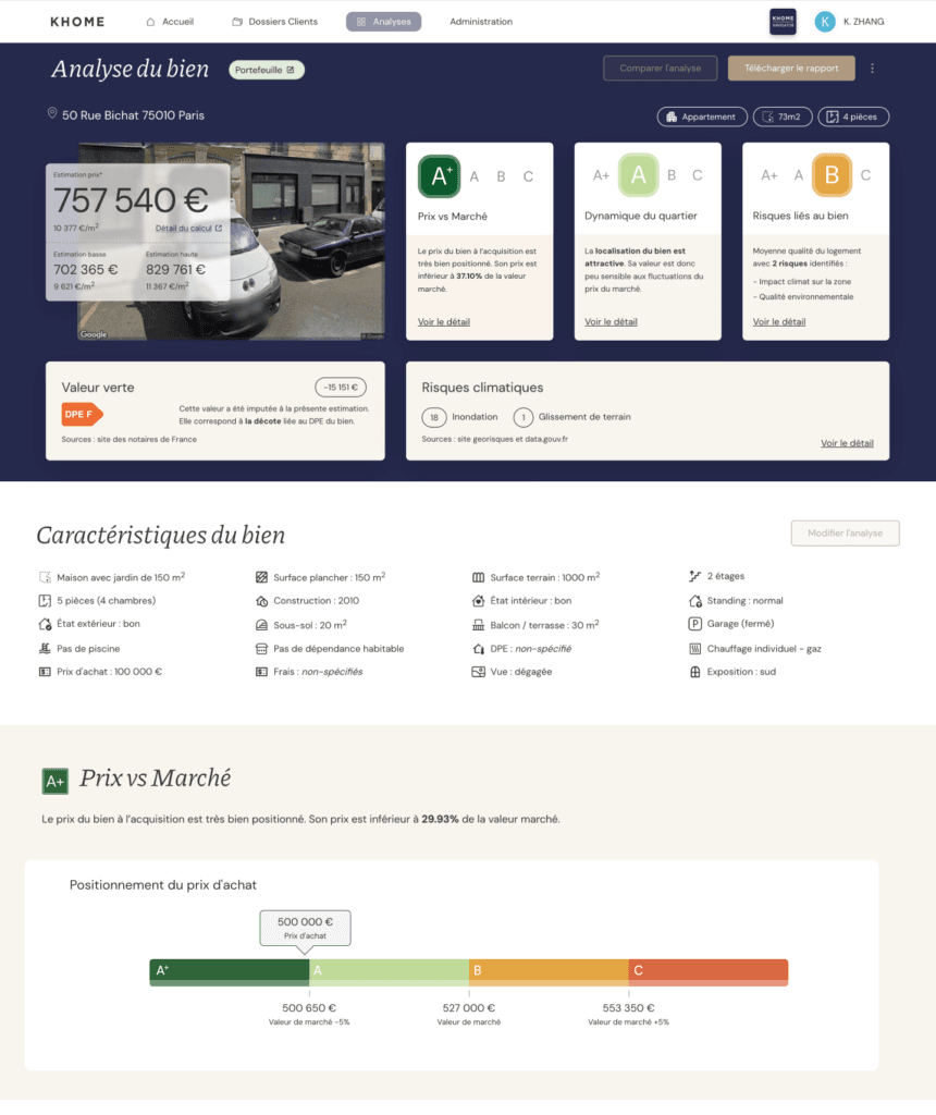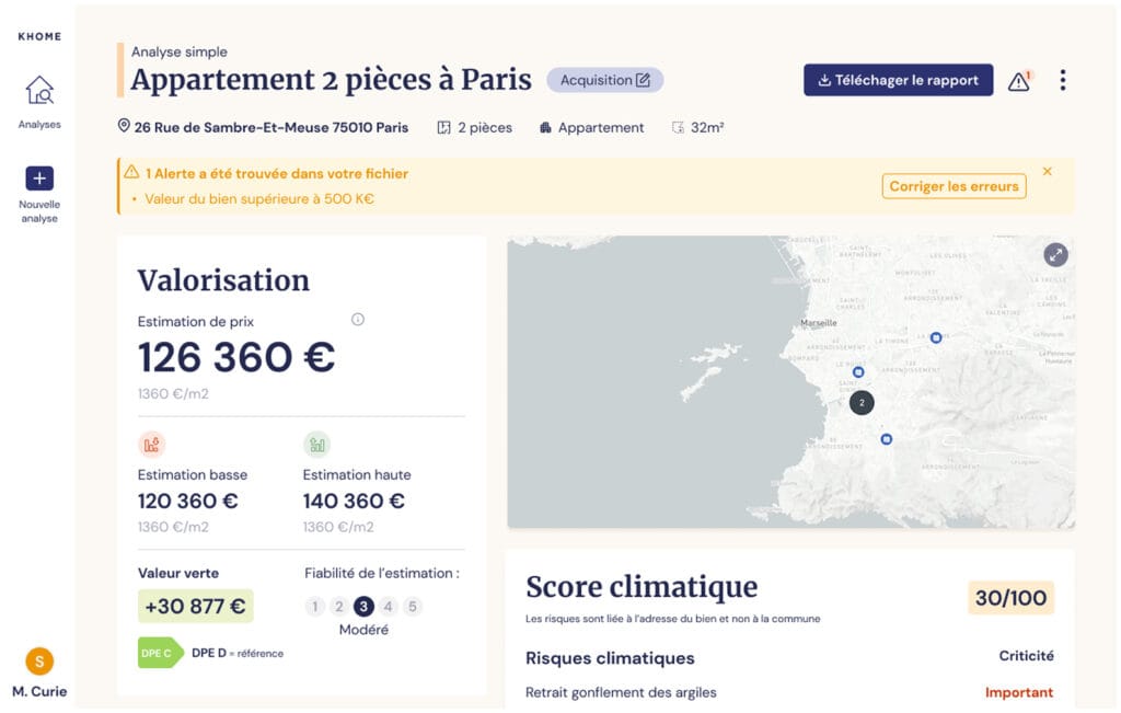 Khome est une startup proptech qui vend un outil d’analyse immobilière aux Caisses Régionales du Crédit Agricole. L’objectif : permettre aux conseillers en charge de l’octroi de prêts immobiliers d’évaluer rapidement la valeur d’un bien, son DPE et ses risques climatiques — des données essentielles pour décider d’accorder ou non un crédit.